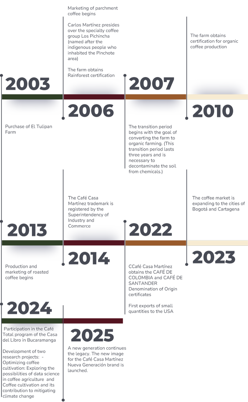 The story of Café Casa Martínez began with the family's dream of creating a place of gathering and retreat, where they could enjoy the tranquility of the countryside. In 2003, the Martínez siblings (Víctor, Teresa, Miguel, Rodolfo, and Carlos) purchased a farm in Pinchote, Santander, with that goal in mind. Since then, El Tulipán farm has become the heart of the Martínez family. In 2005, Carlos Martínez and his wife were among the first to settle there, enjoying the transition from the city to the countryside. Little by little, other siblings also moved in, creating a true family community. In Víctor's words, the farm is "a hearth," where you can feel the warmth and unity of the family. Even those who don't live there permanently come frequently to enjoy this space.